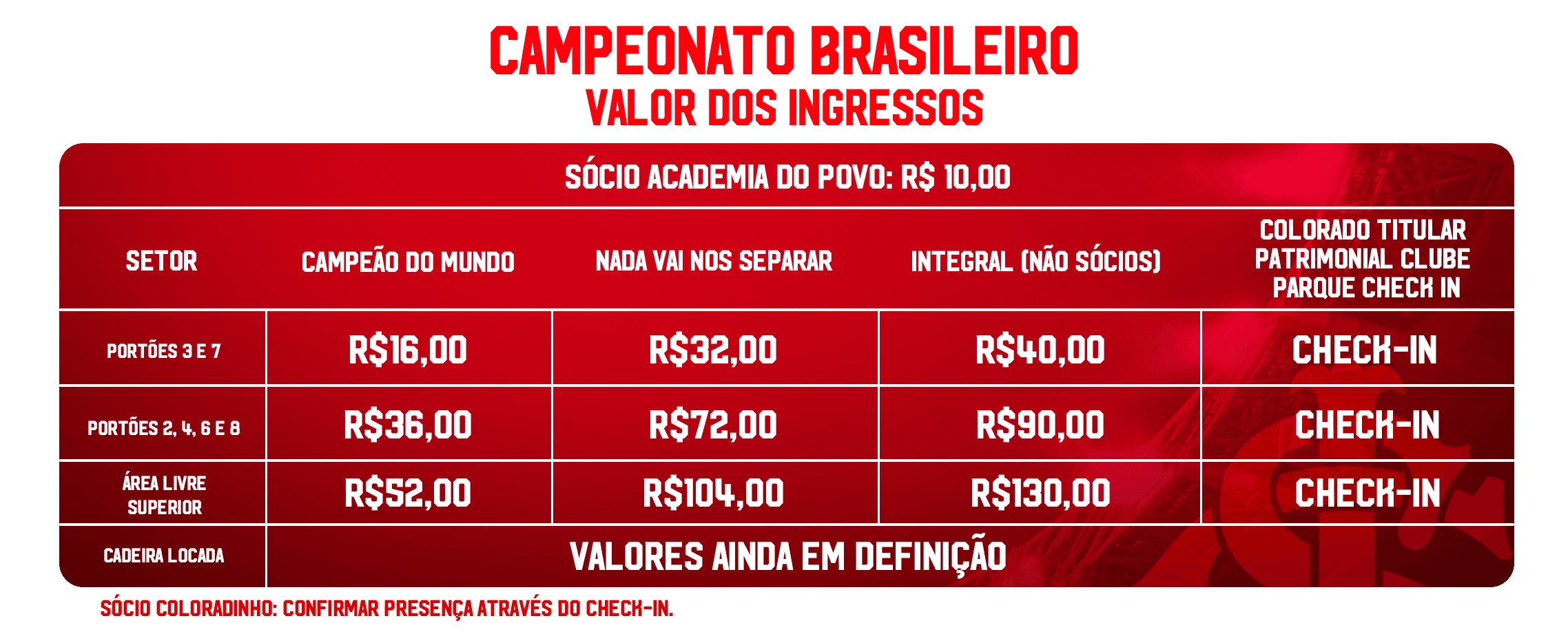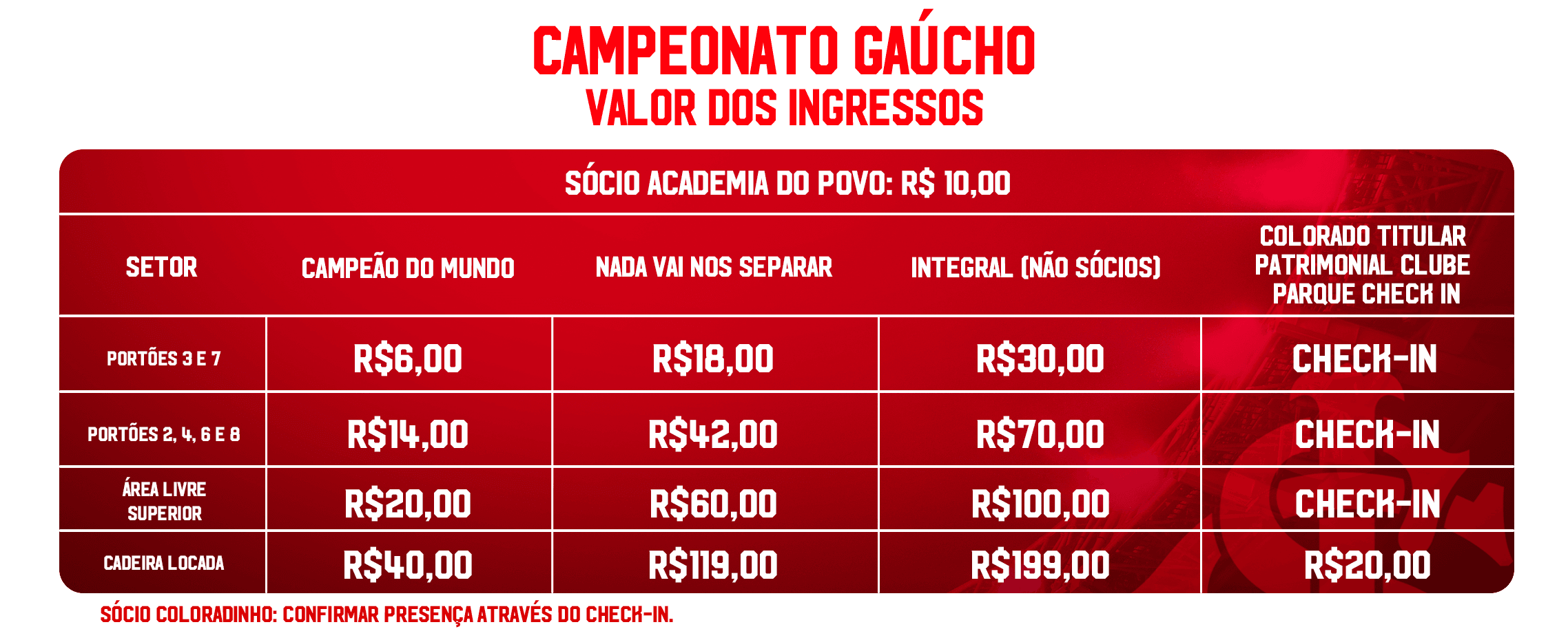 A estratégia de precificação para 2026 prevê valores acessíveis em todo o Beira-Rio, tanto para associados(as) quanto para não sócios(as). Os(as) sócios(as) Campeão do Mundo e Nada Vai Nos Separar terão descontos ampliados durante o Gauchão, de 80% e 40%, respectivamente, acima do padrão habitual que é de 60% e 20%, Já o(a) Sócio(a) Academia do Povo poderá adquirir ingresso para qualquer setor de área livre do estádio pelo valor fixo de 10 reais.